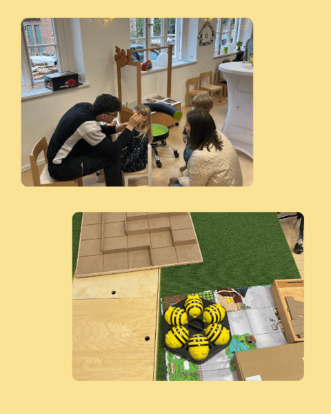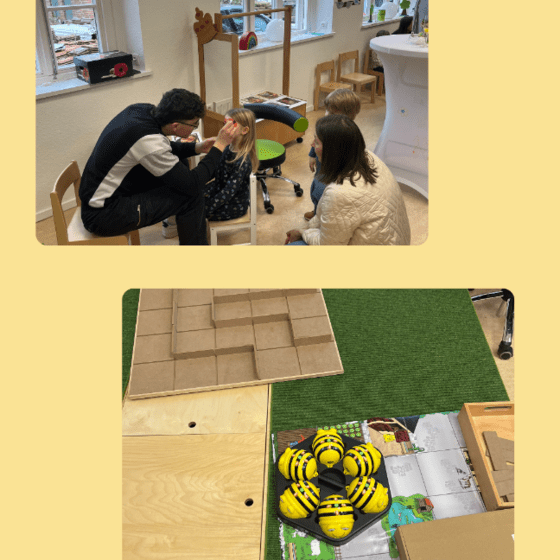 Nach dem offiziellen Teil fand noch ein Tag der offenen Tür statt. Alle Gäste hatten Gelegenheit, unsere Räumlichkeiten zu besichtigen und mit dem Team ins Gespräch zu kommen. Auch für die jüngsten Besucher gab es ein abwechslungsreiches Programm. Beim Kinderschminken konnten sie in fantasievolle Rollen schlüpfen, während sie an einer weiteren Station Masken für den bevorstehenden Karneval basteln konnten. In Fühlboxen galt es, verschiedene Materialien zu ertasten, und an der Station mit Bee-Bots konnten Kinder spielerisch erste Erfahrungen im Programmieren sammeln.